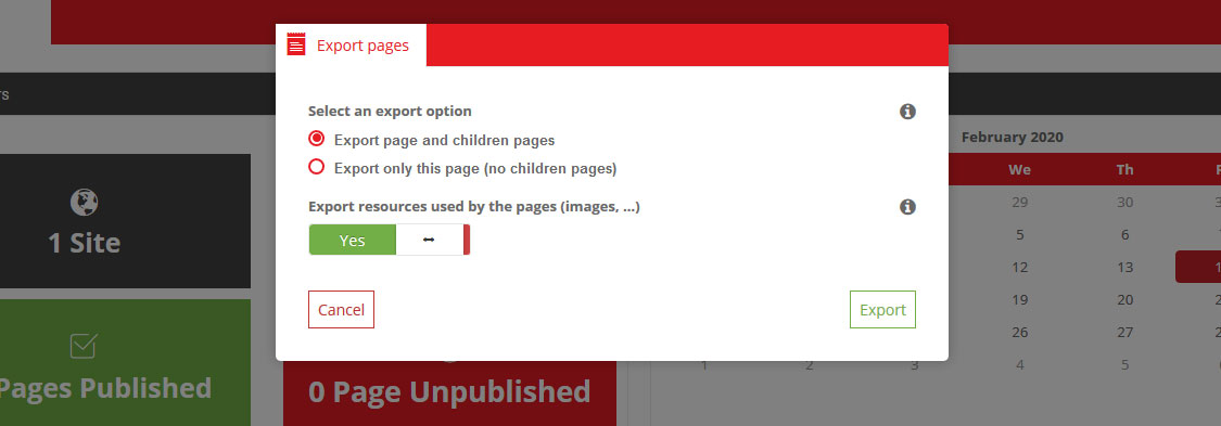 This feature comes with many options. Export the selected page only or the page with its children pages. Additionnally there is an option to also include the ressources used by the pages like pictures, videos, etc...