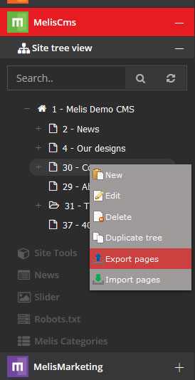 Yes you heard it, Melis Platform is now giving the possibility to export and import pages with a simple right click on the treeview.