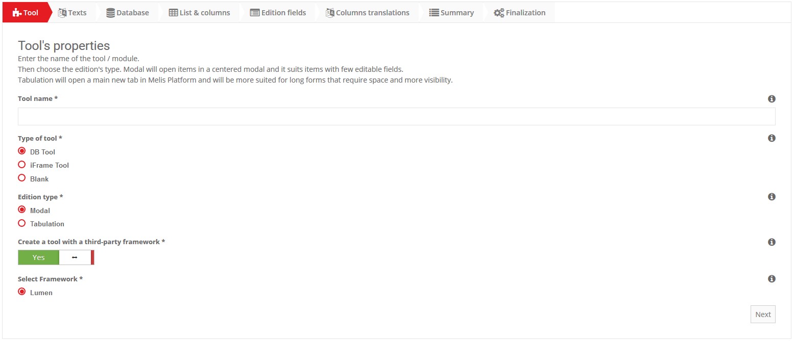 You go through the process of selecting your tables, the fields to display, the ones to edit, the field titles and boom your tool is created with the framework selected.