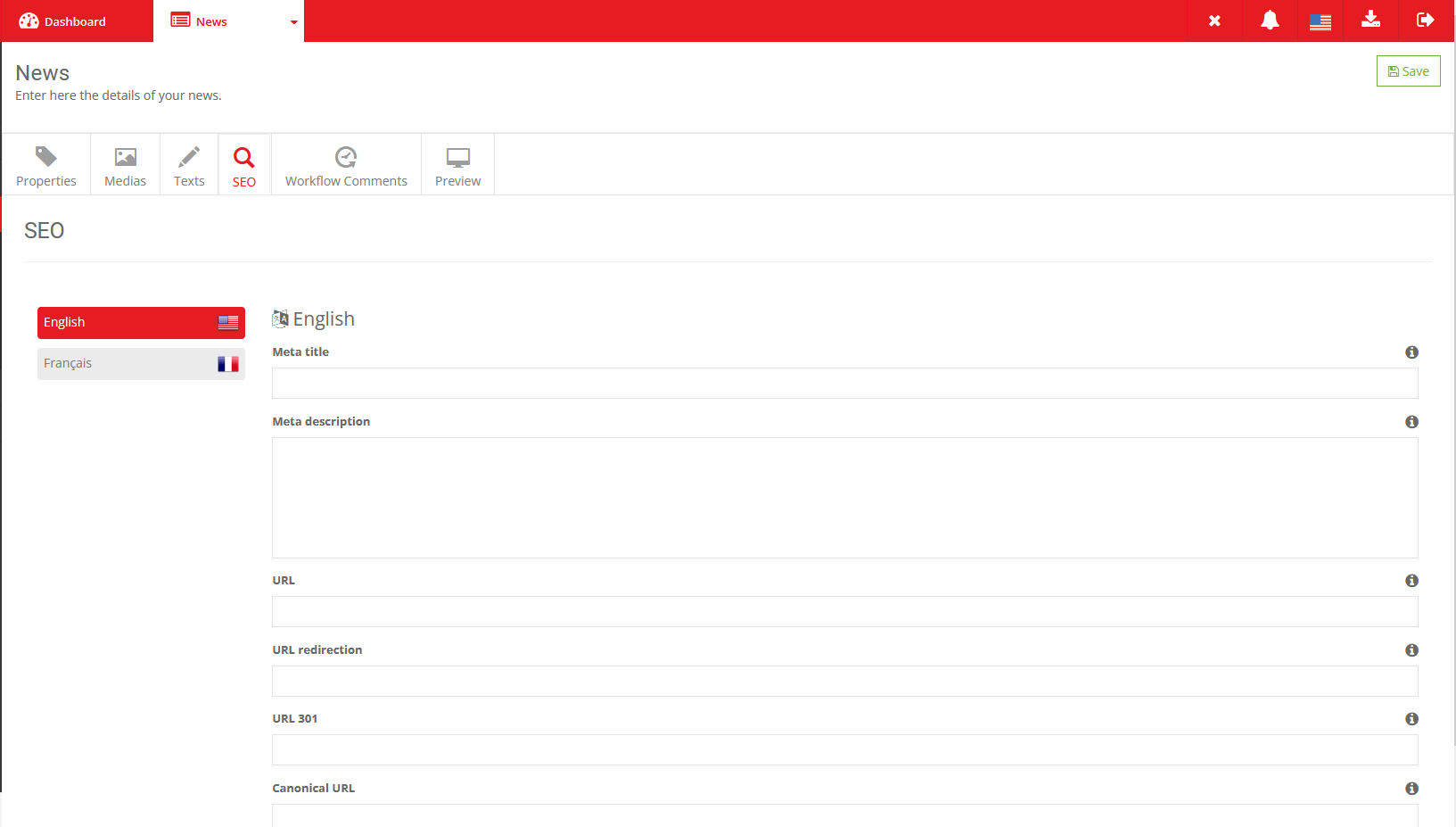 So title, description, URls, etc... all SEO aspects can be managed from each news directly.